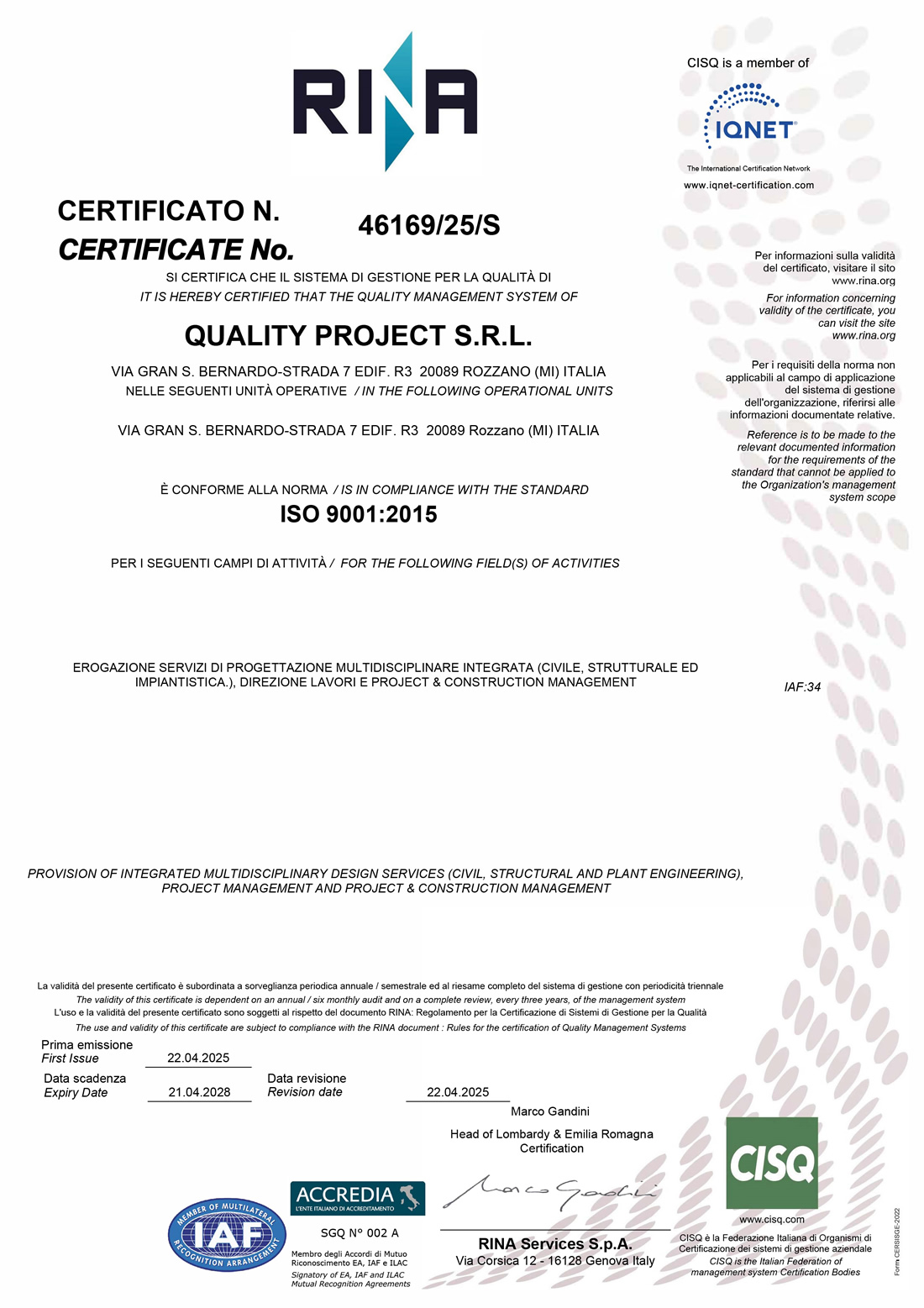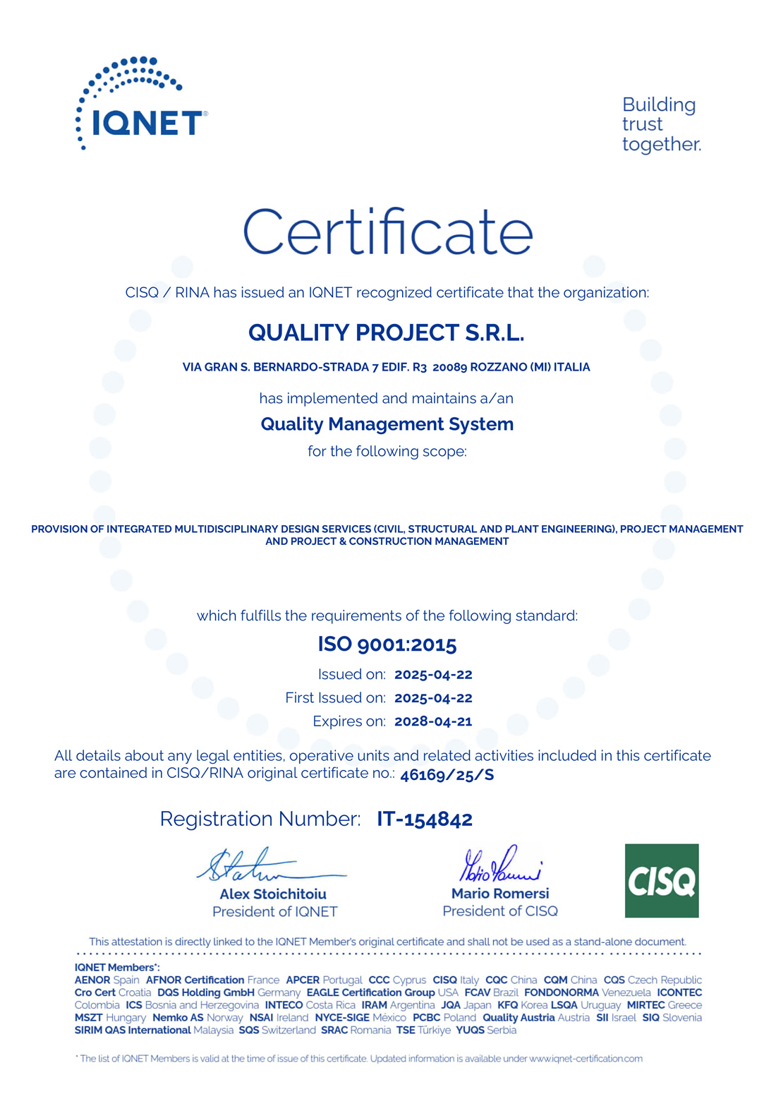QProject ha ottenuto la certificazione IQNET per il proprio Sistema di Gestione per la Qualità, riconoscimento che conferma l’impegno dell’azienda nel garantire standard elevati e costanti nei propri processi e servizi.